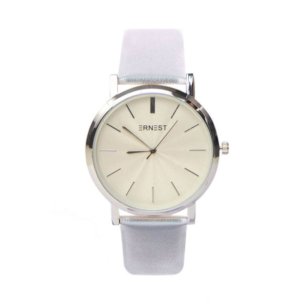 Prachtig Ernest horloge in een prachtige zilverkleur! Het klokje is in zilver metaal, evenals de sluiting. De band is in leerlook. Mooi straks en subtiel Ernest horloge. Je shopt dit dameshorloge ook in andere kleuren in onze webshop, met zilveren of met rose goud details.
