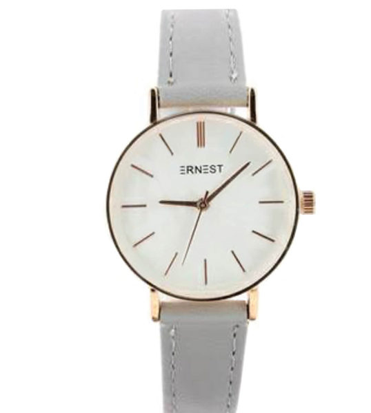 Ben je op zoek naar een kleiner model van Ernest horloge? Dit leuke Ernest horloge met leren bandje in grijs is erg mooi! Het metaal is in rose goud. Ideaal wanneer je op zoek bent naar een kleiner horloge, omdat je bijvoorbeeld een erg dunne pols hebt of gewoon omdat je het mooi vindt!