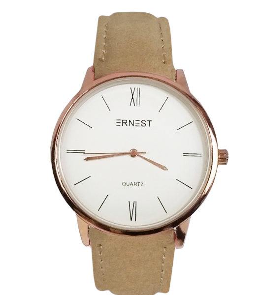 Ernest horloge met een band in de kleur crème. De metalen details rondom de wijzerplaat is rose goud. Dit is een mooie combinatie van kleuren.