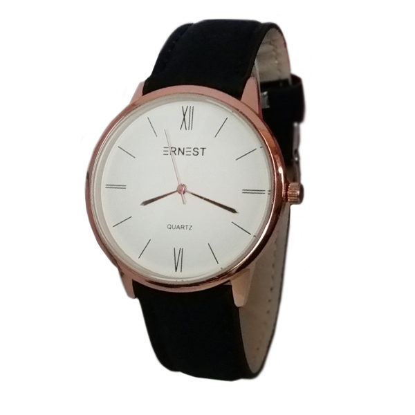 Ernest horloge met een suède band in zwart. De metalen details rondom de wijzerplaat is rose goud.